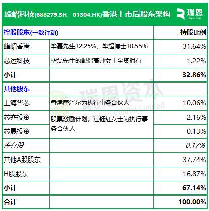 招股书显示,峰岹科技在香港上市后的股东架构中,毕磊先生、毕超博士、高帅女士(毕磊先生的配偶)为一致行动人,间接持股约32.86%,拥有32.91%的投票权(不计库存股)。
