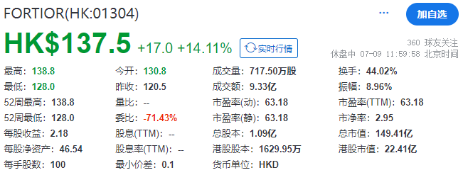 截至午间收市,峰岹科技港股每股报137.50港元,大涨14.11%,总市值约149.41亿港元。